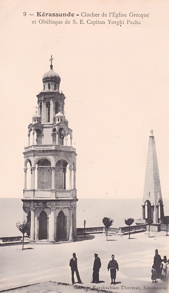 The clock tower of the church of the Transfiguration of Jesus (Μεταμόρφωση του Σωτήρως) and to the right, the obelisk of Captain Yorghi Pasha. Editeur: Karakachian Thovmas.